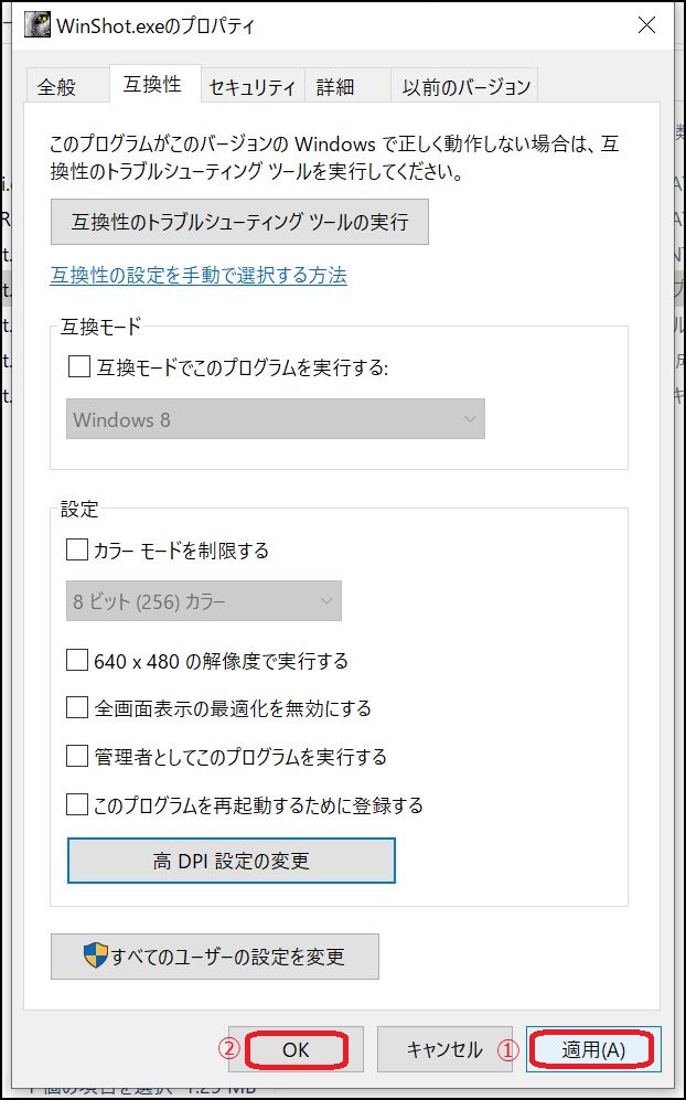 互換性タブ⇒[高DPI設定の変更]をクリック